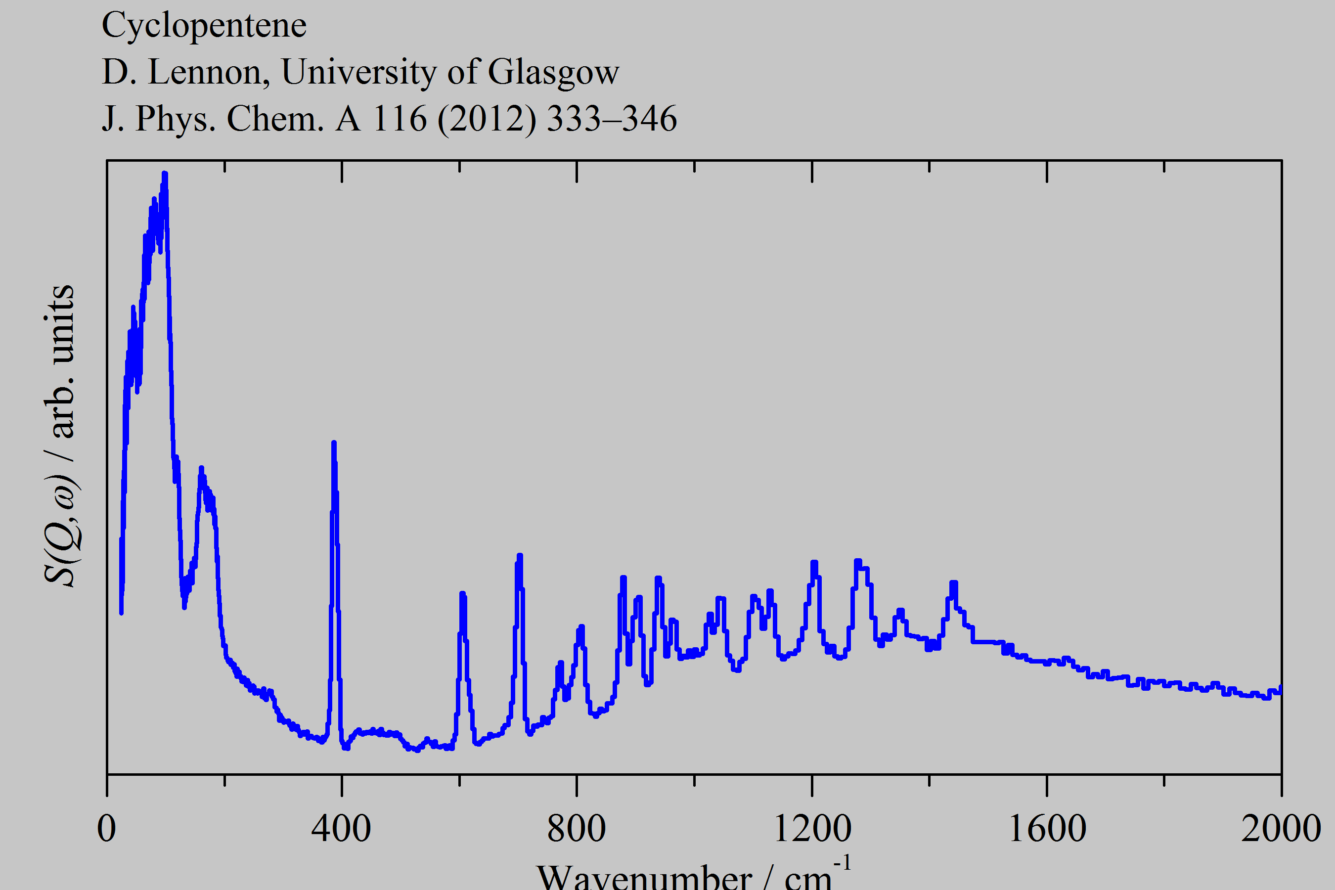 Inelastic Neutron Scattering spectrum of Cyclopentene, C₅H₁₀, measured on the TOSCA instrument.