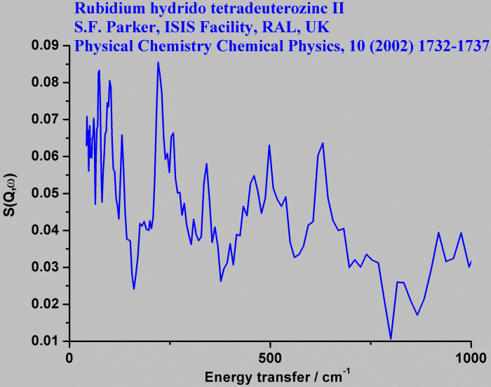 Inelastic Neutron Scattering spectrum of Rubidium deutero tetradeuterotezinc (II), Rb₃ZnD₅, measured on the TFXA instrument. (Rb+)3(D-)[ZnD4]2-.