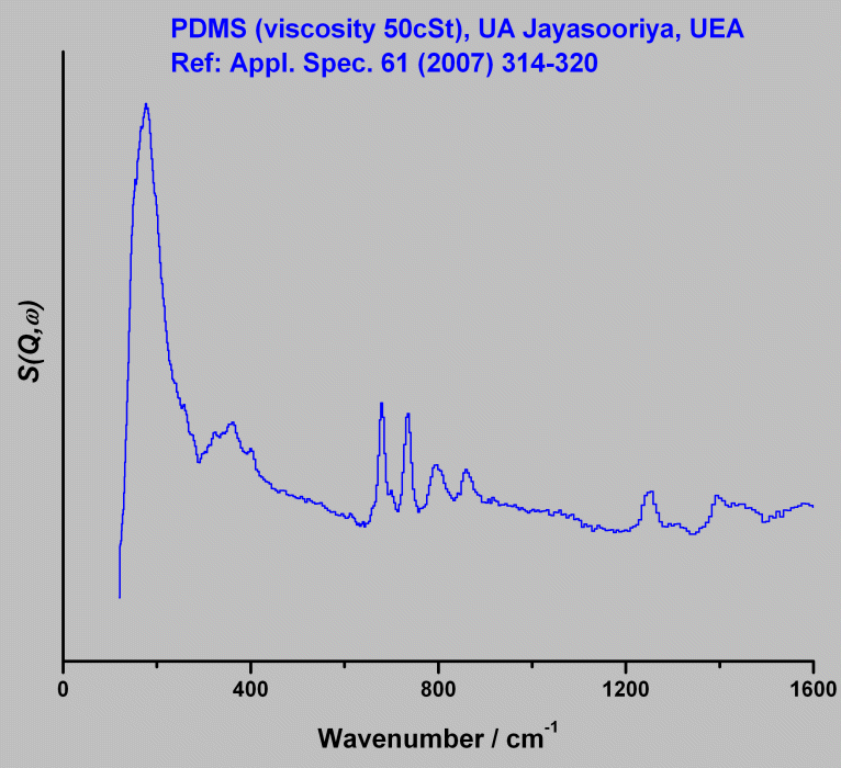 Inelastic Neutron Scattering spectrum of PDMS (PolyDiMethylSiloxane, viscosity 50 cSt), [Si(CH₃)₂O]n, measured on the TOSCA instrument.