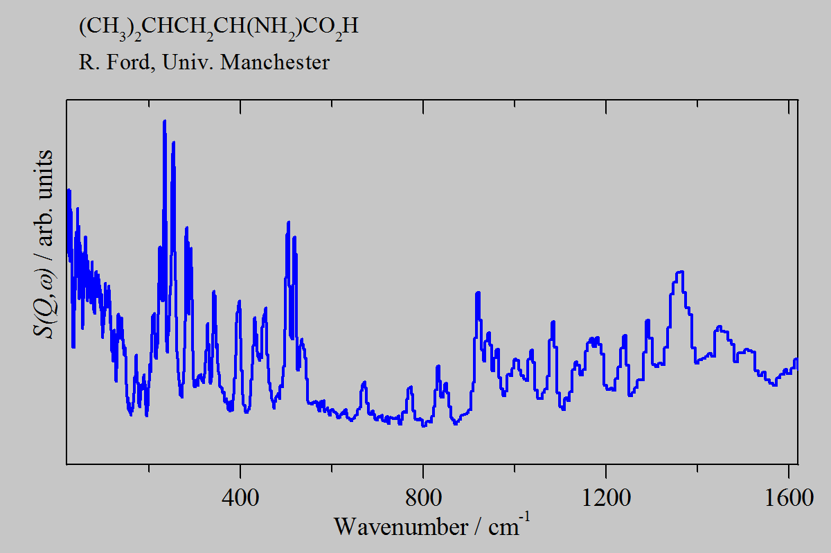 Inelastic Neutron Scattering spectrum of Leucine, (CH3)2CHCH2CH(NH2)CO2H, measured on the TOSCA instrument.