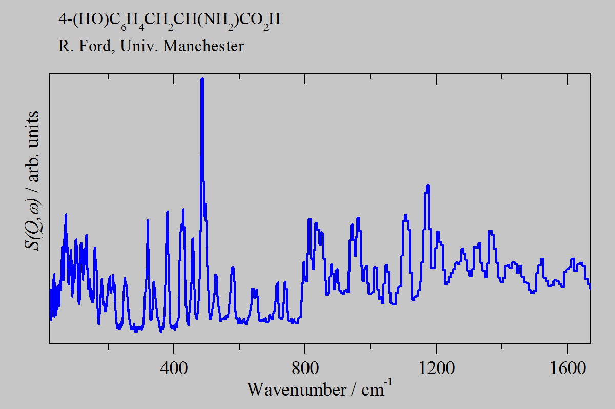 Inelastic Neutron Scattering spectrum of Tyrosine, 4-(HO)C6H4CH2CH(NH2)CO2H, measured on the TOSCA instrument.