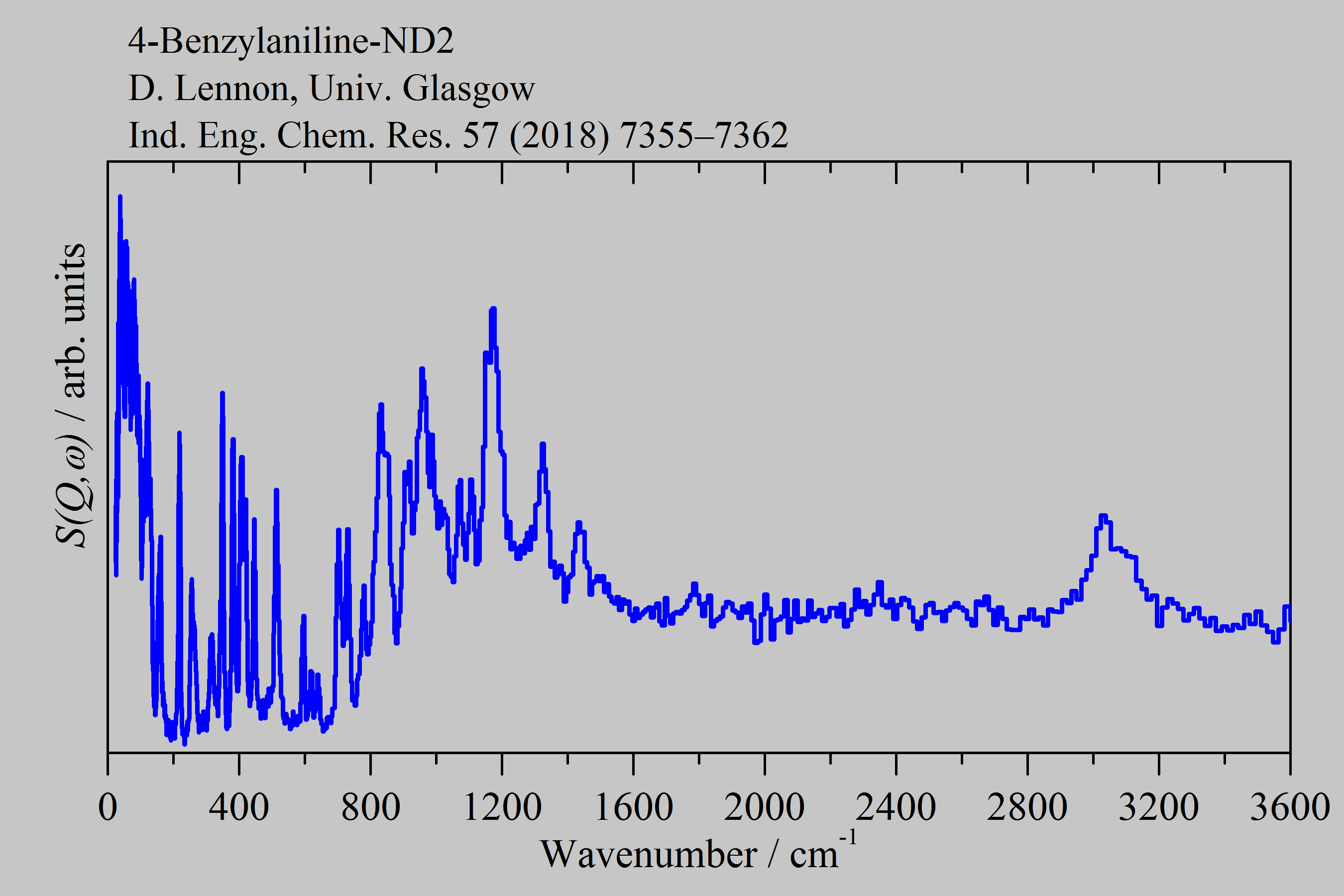Inelastic Neutron Scattering spectrum of 4-Benzylaniline-ND2, C6H4CH2C6H4ND2, measured on the TOSCA instrument.