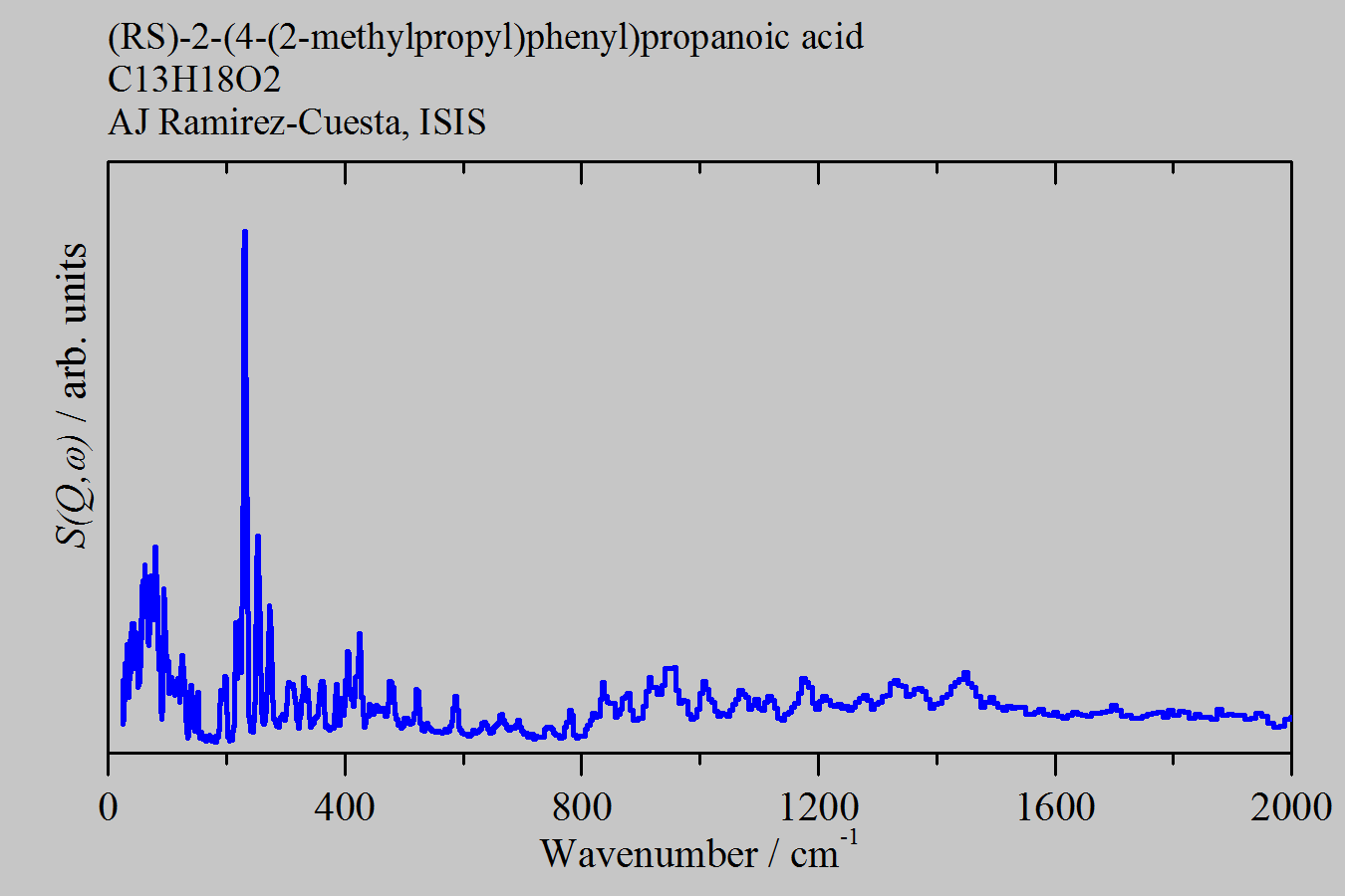 Inelastic Neutron Scattering spectrum of (RS)-2-(4-(2-Methylpropyl)phenyl)propanoic acid, C₁₃H₁₈O₂, measured on the TOSCA instrument. Ibruprofen.