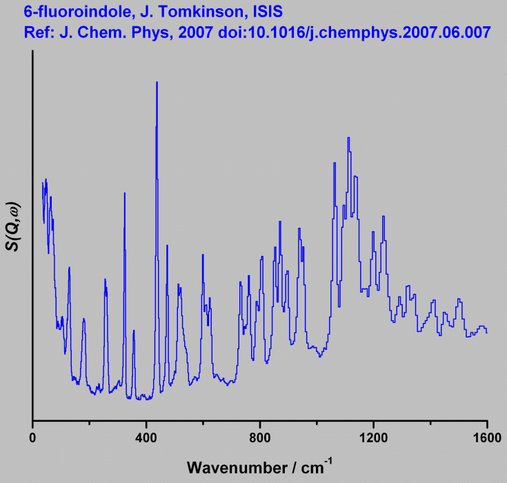 Inelastic Neutron Scattering spectrum of 6- Fluoroindole, C₈H₆NF, measured on the TOSCA instrument.