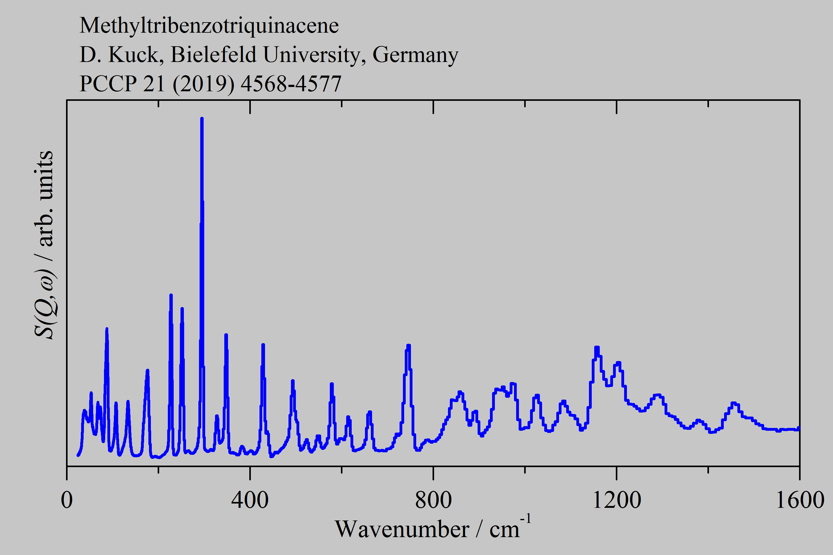 Inelastic Neutron Scattering spectrum of Methyltribenzotriquinacene, C23H18, measured on the TOSCA instrument.