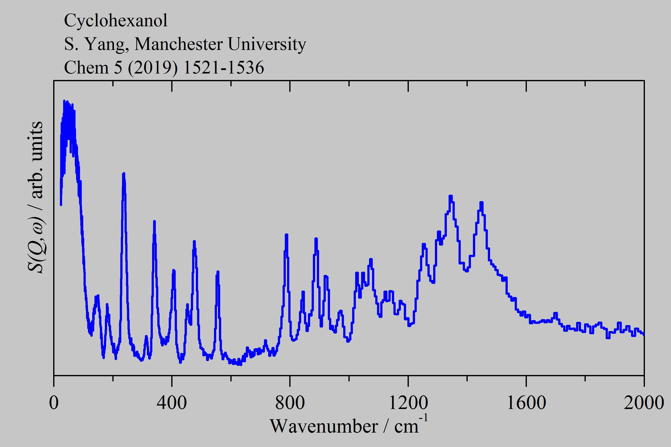 Inelastic Neutron Scattering spectrum of Cyclohexanol, C6H12O, measured on the TOSCA instrument.