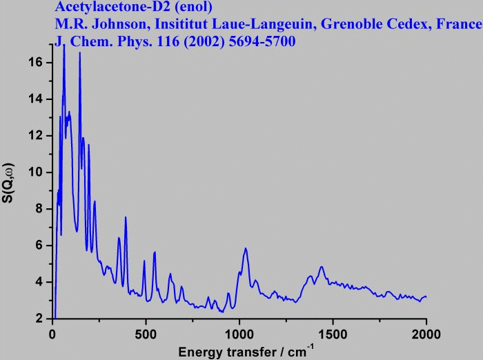 Inelastic Neutron Scattering spectrum of Acetylacetone-D2 (enol), CH₃C(OD)=CDCOCH₃, measured on the TFXA instrument.