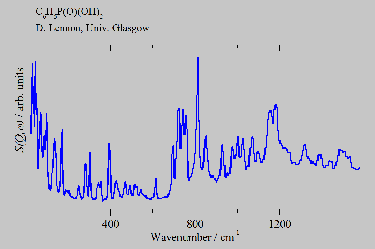 Inelastic Neutron Scattering spectrum of Phenylphosphonic acid, C6H5P(O)(OH)2, measured on the TOSCA instrument.