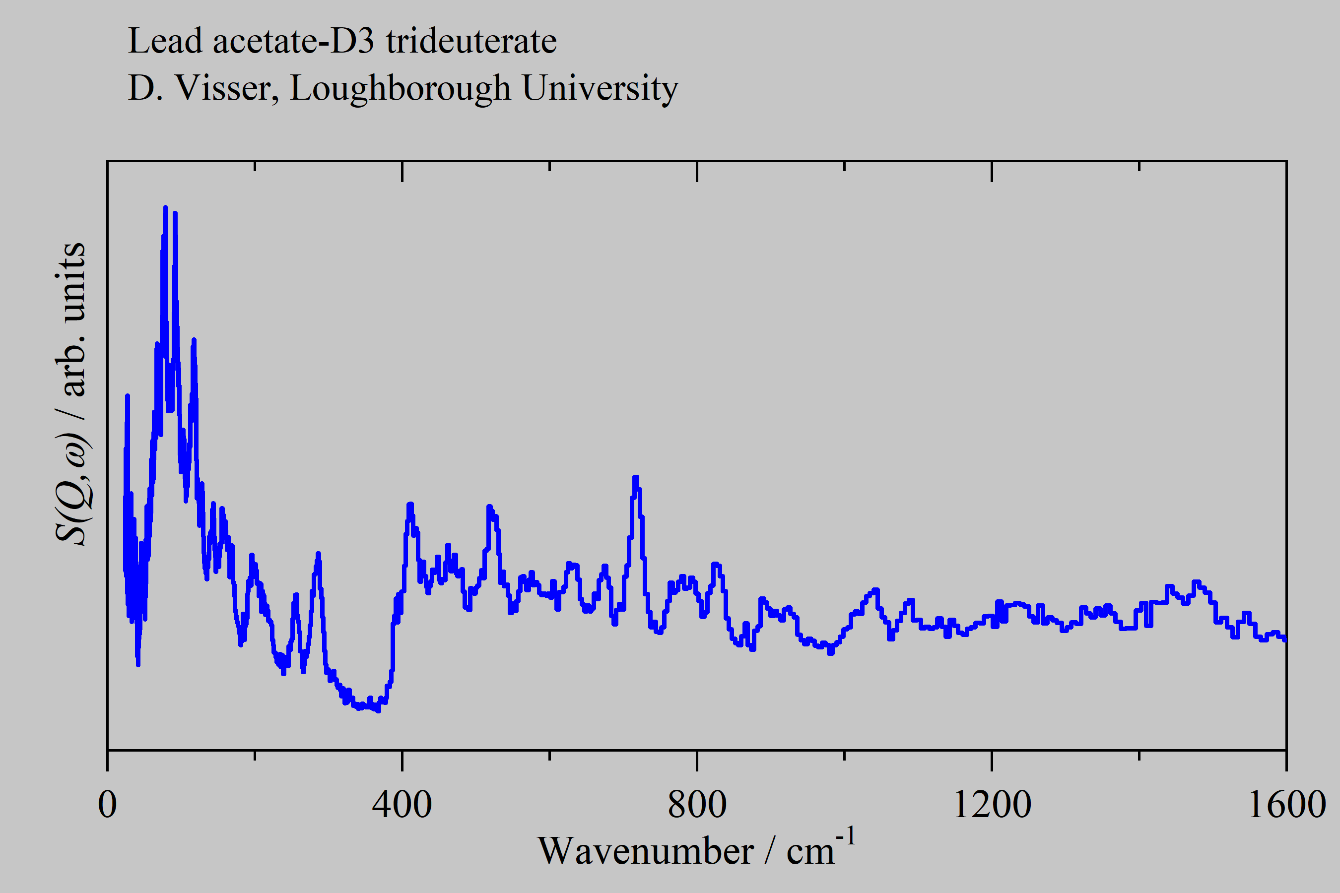 Inelastic Neutron Scattering spectrum of Lead acetate-D3 trideuterate, Pb(CD3CO2)2.3D2O, measured on the TOSCA instrument.