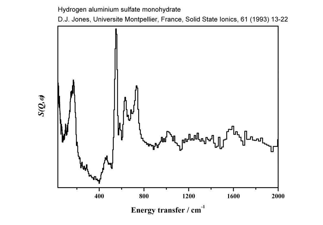Inelastic Neutron Scattering spectrum of Hydrogen aluminium sulfate monohydrate, HAl(SO4)2.H2O, measured on the TFXA instrument. Contains hydroxium ions: formula is (H3O0Al(SO4)2.