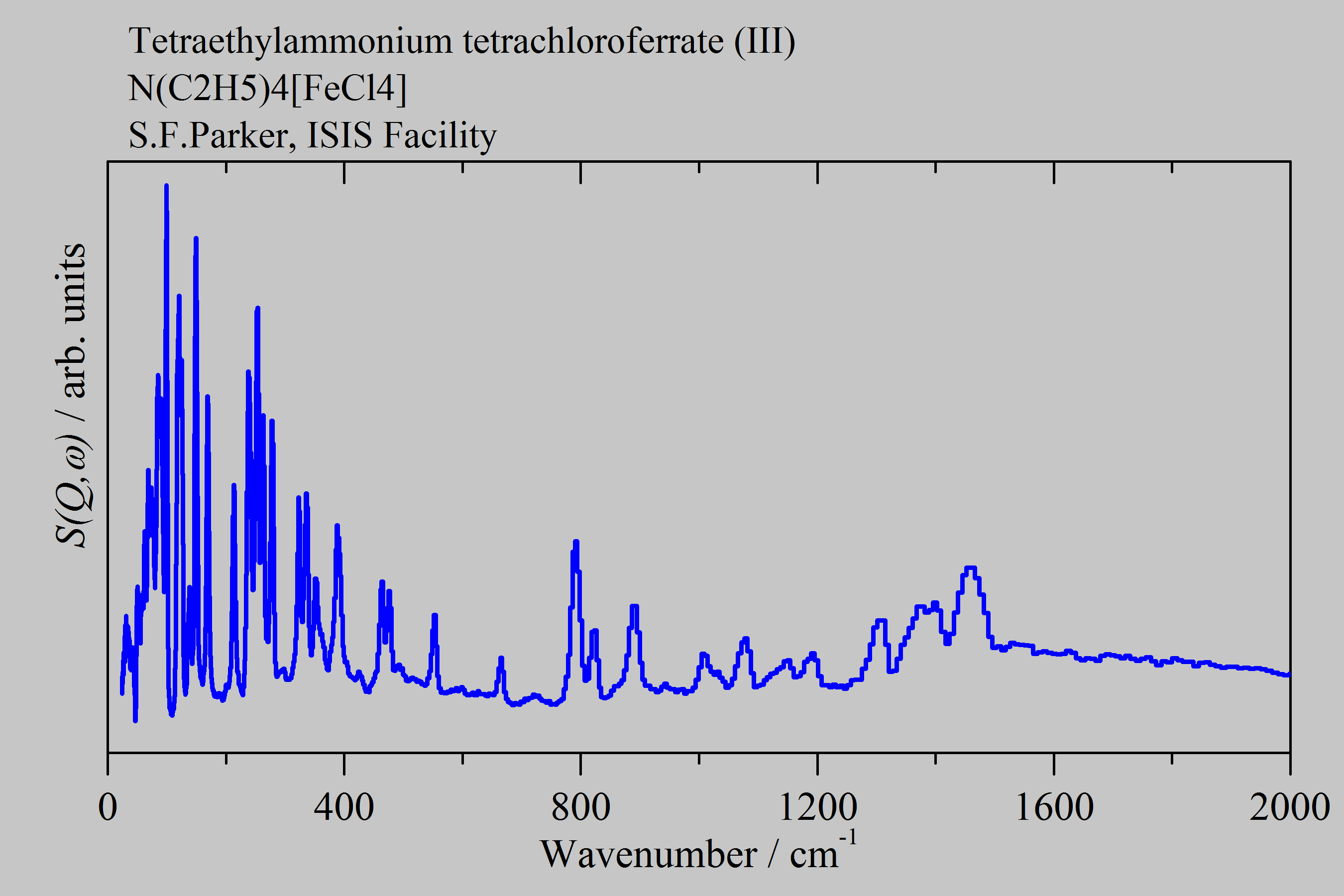 Inelastic Neutron Scattering spectrum of Tetraethylammonium tetrachloroferrate (III), C8Cl4FeH20N, measured on the TOSCA instrument.