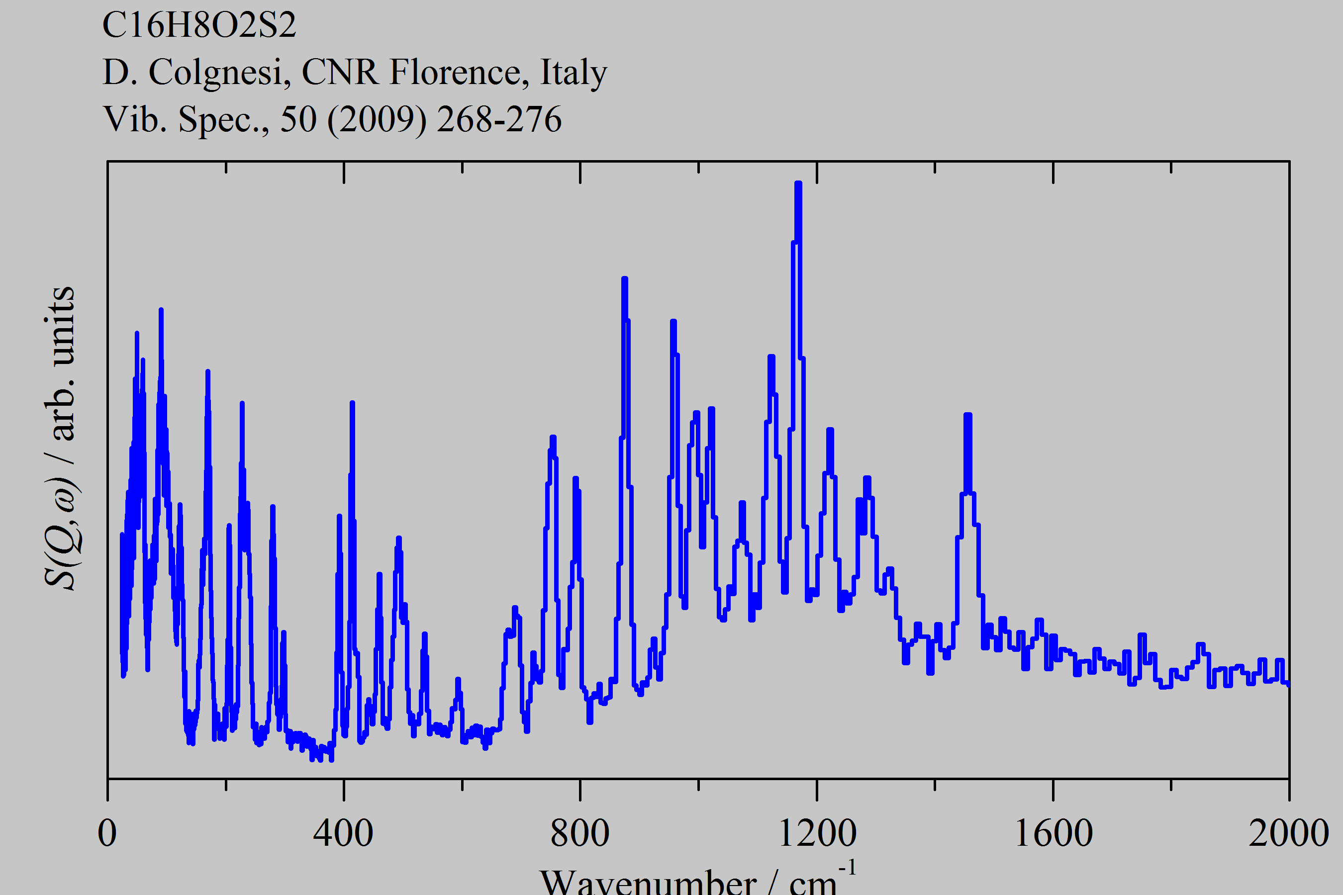 Inelastic Neutron Scattering spectrum of Thioindigo, C₁₆H₈O₂S₂, measured on the TOSCA instrument.