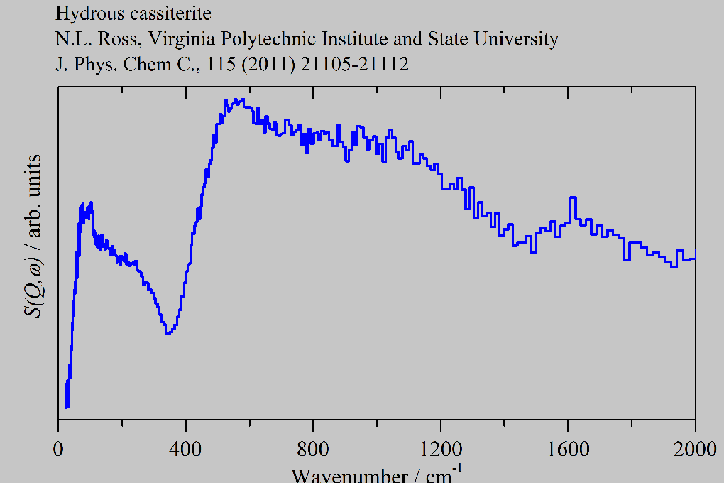 Inelastic Neutron Scattering spectrum of Hydrous cassiterite 2nm, SnO2 0.82H2O, measured on the TOSCA-1 instrument. Hydrous cassiterite 2 nm particles.