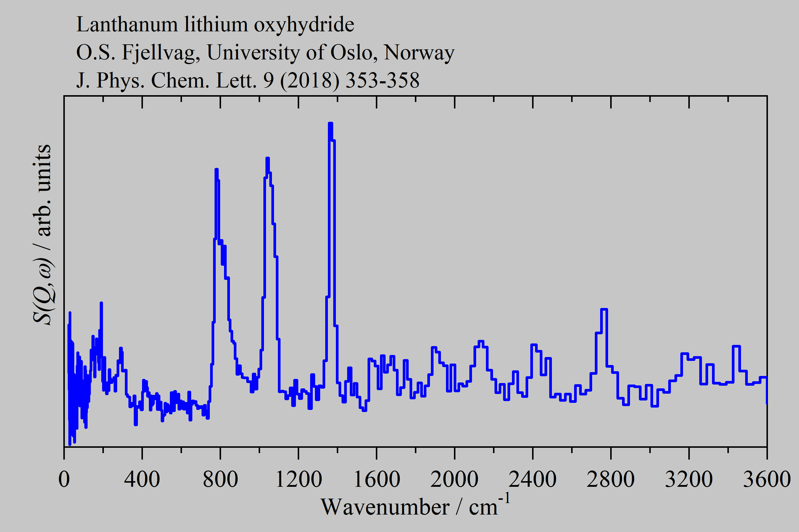 Inelastic Neutron Scattering spectrum of Lanthanum lithium oxyhydride, HLa2LiO3, measured on the TOSCA instrument.