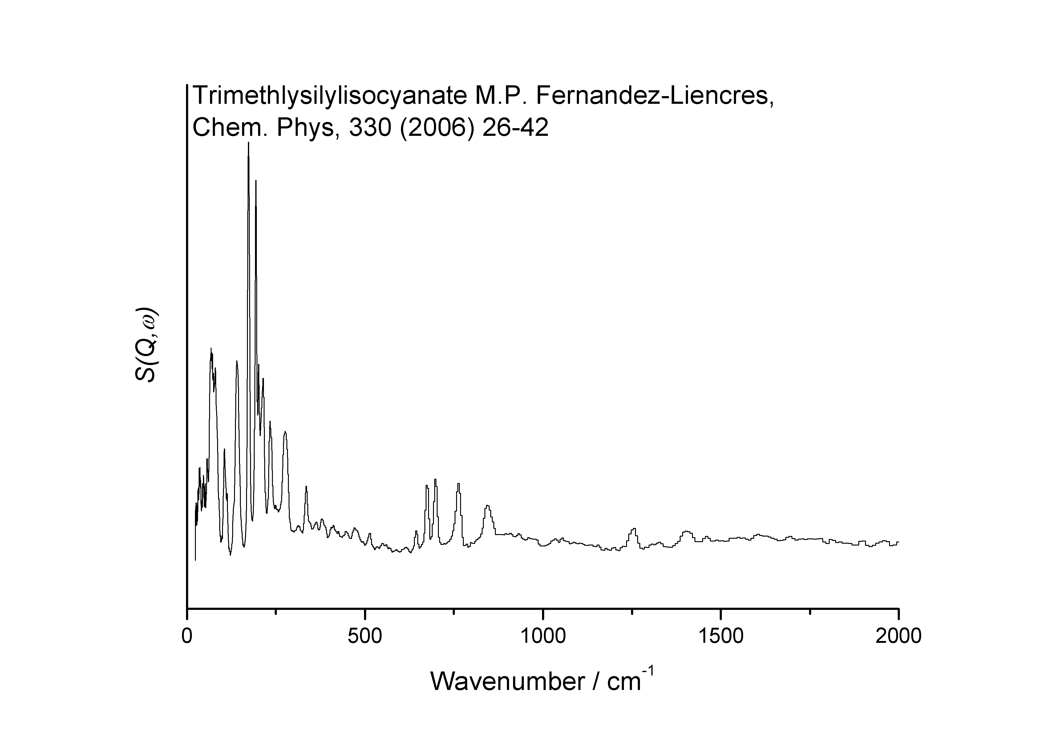Inelastic Neutron Scattering spectrum of Trimethlysilylisocyanate, (CH₃)₃SiNCO, measured on the TOSCA instrument. 1,3,5-trimethyl-2,4,6-triiodobenzene.