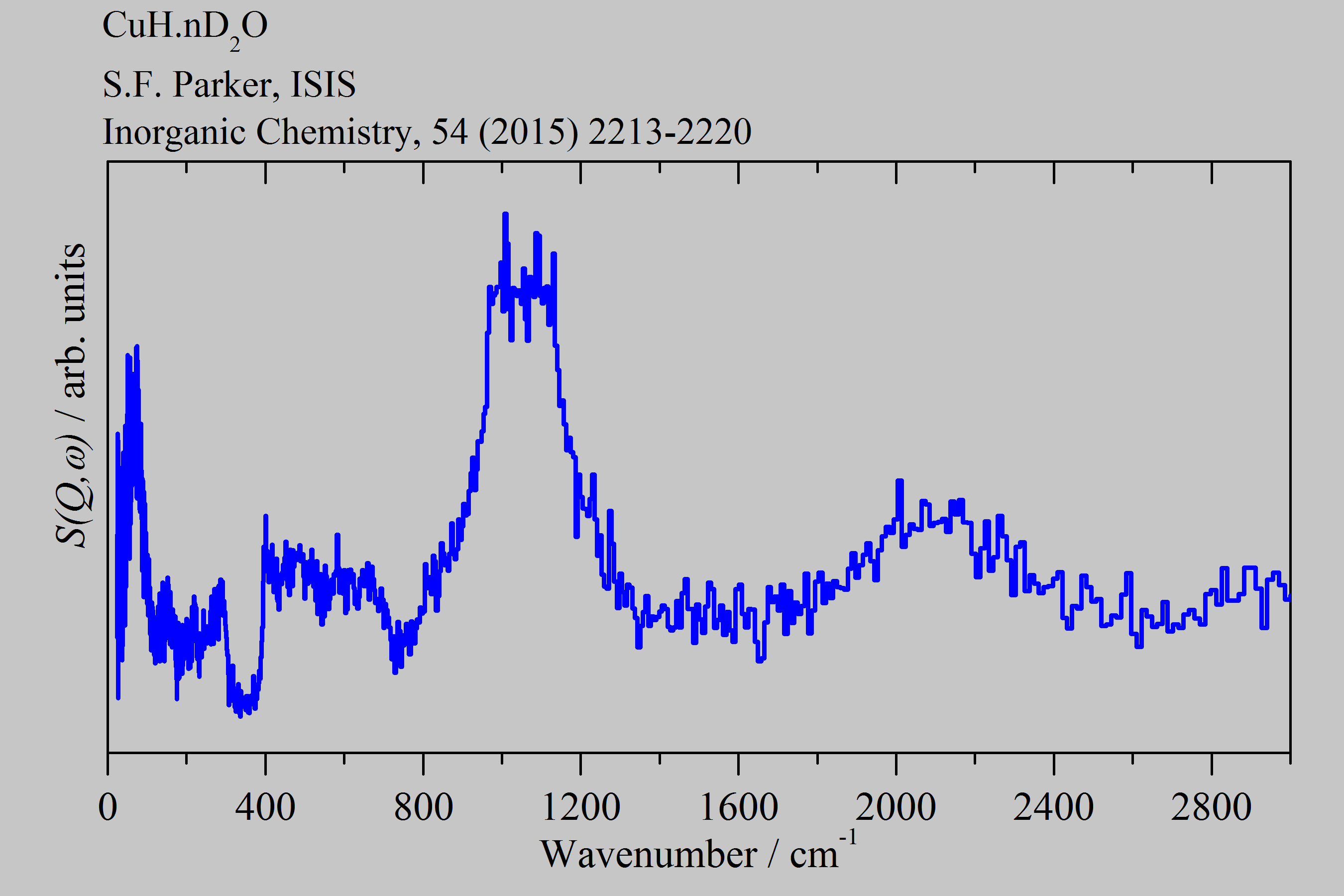 Inelastic Neutron Scattering spectrum of Copper (I) hydride D2O, CuH.nD2O, measured on the TOSCA instrument. Prepared by the Wurtz method. Core-shell structure (CuH core, water shell exchanged for D2O)..