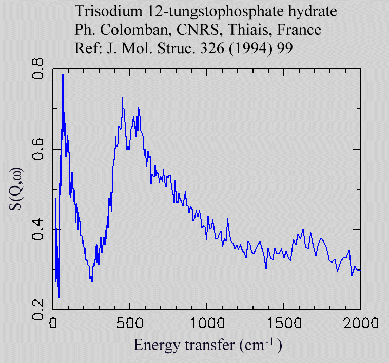 Inelastic Neutron Scattering spectrum of 12-Tungstophosphate hydrate trisodium salt, Na3PW12O40.12H2O, measured on the TFXA instrument.