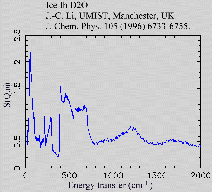 Inelastic Neutron Scattering spectrum of Ice Ih deuterated, D₂O, measured on the TOSCA-1 instrument.