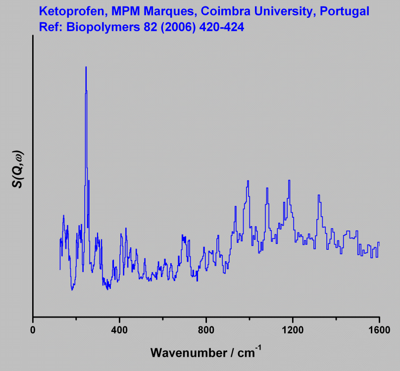 Inelastic Neutron Scattering spectrum of Ketoprofen, C₁₆H₁₄O₃, measured on the TOSCA instrument. Systematic name: 3-benzoyl-alpha-methylbenzeneacetic acid.