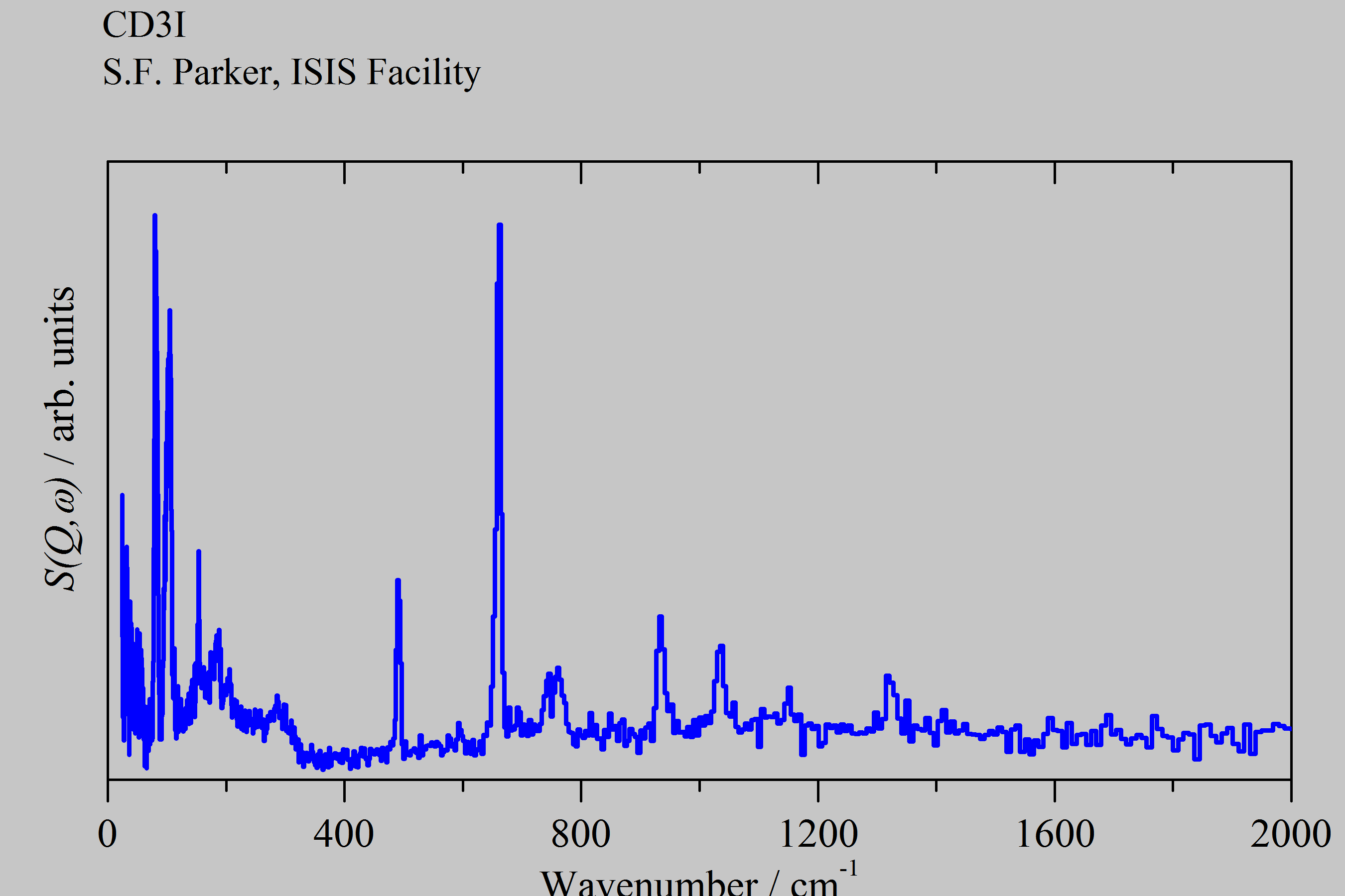 Inelastic Neutron Scattering spectrum of Iodomethane-D3, CD₃I, measured on the TOSCA instrument.