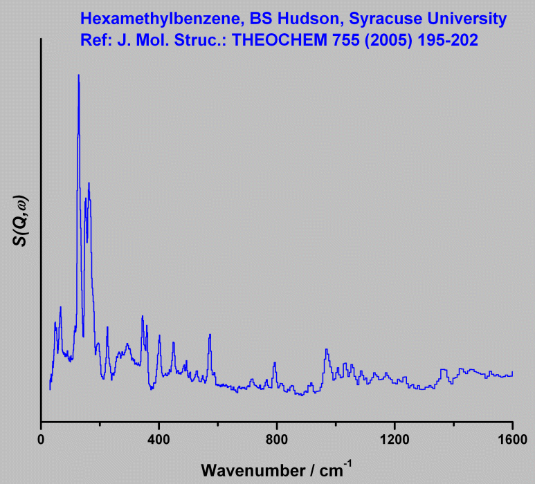 Inelastic Neutron Scattering spectrum of Hexamethylbenzene, C₁₂H₁₈, measured on the TOSCA instrument.