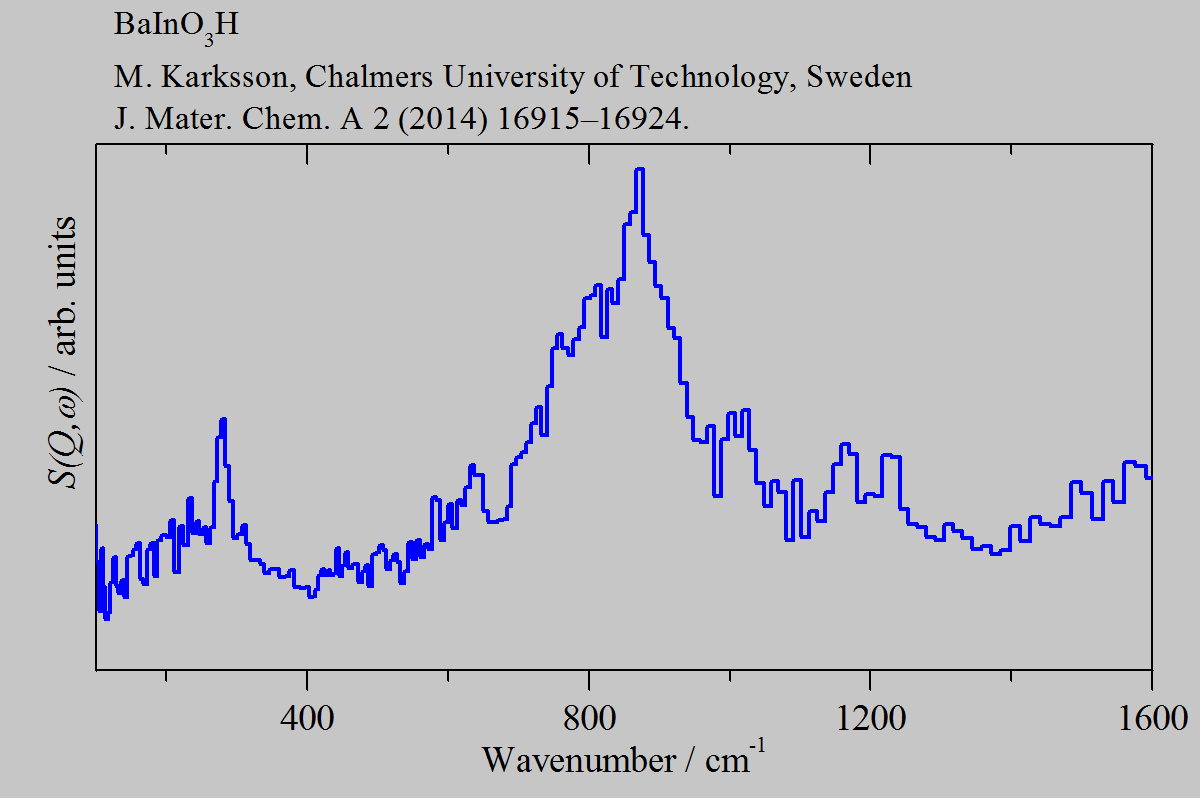 Inelastic Neutron Scattering spectrum of Hydrous barium indium oxide, BaInO3H, measured on the TOSCA instrument.