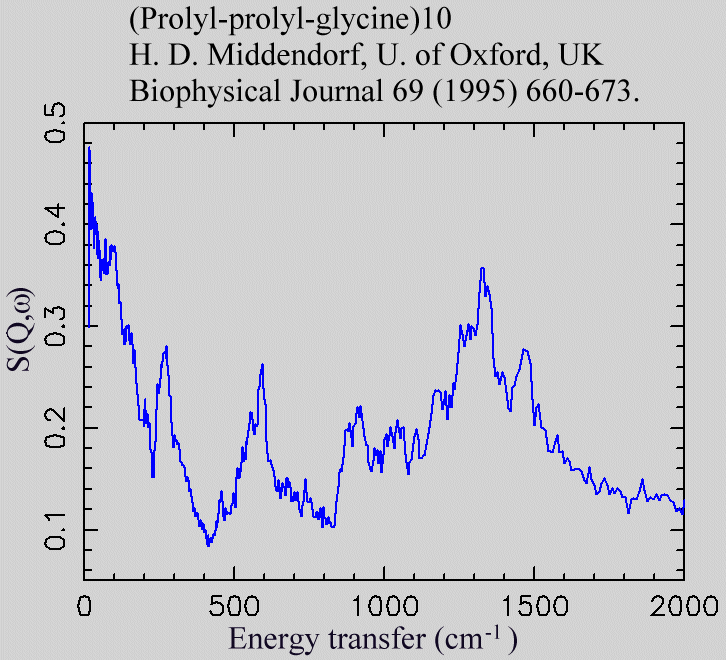 Inelastic Neutron Scattering spectrum of (Prolyl-prolyl-glycine)10, , measured on the TFXA instrument.