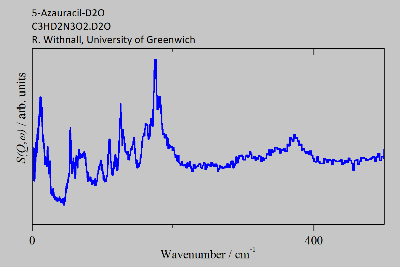 Inelastic Neutron Scattering spectrum of 5-Azauracil D2O, C3H3N3O2.D2O, measured on the TOSCA-1 instrument.