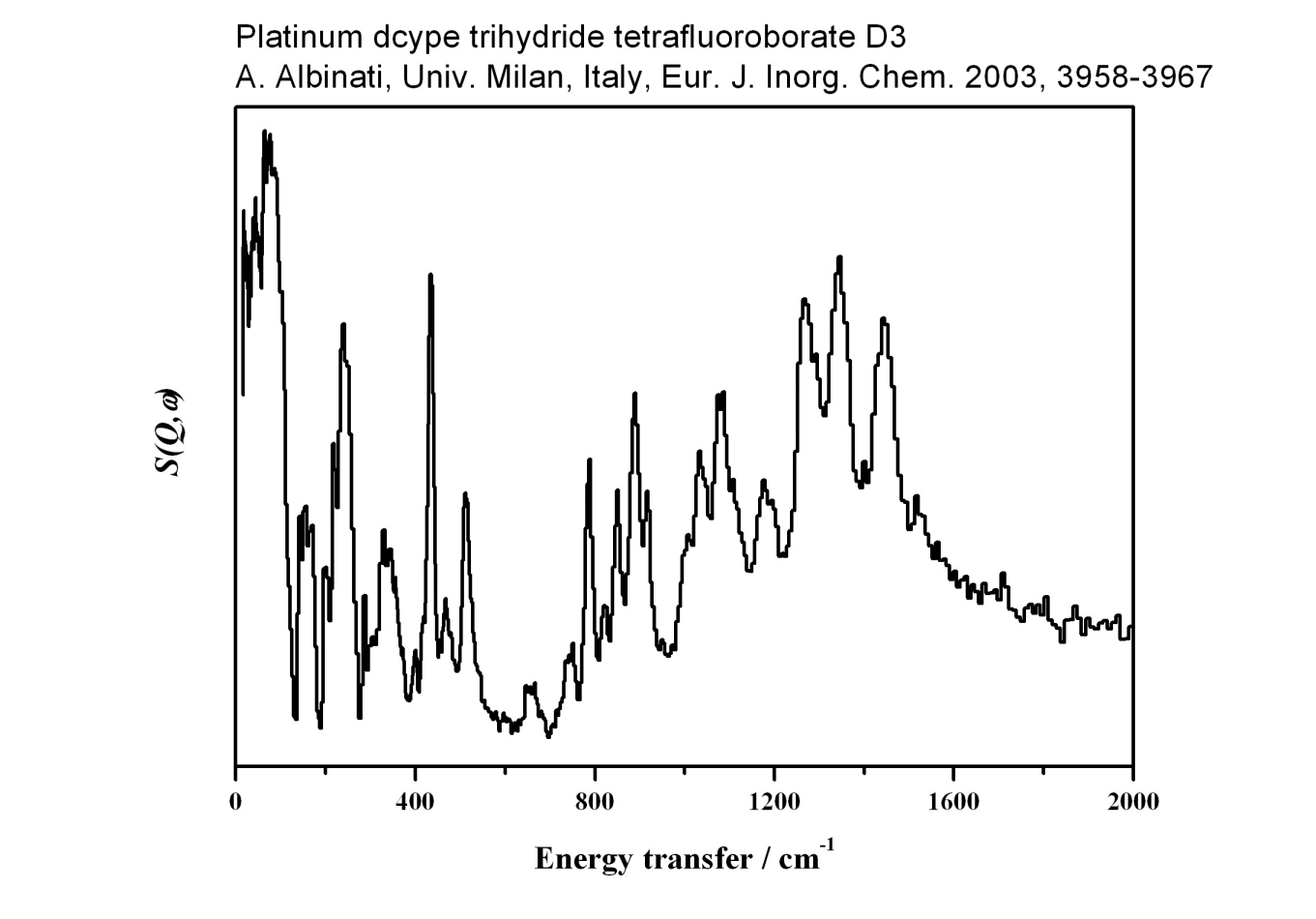 Inelastic Neutron Scattering spectrum of Platinum dcype trihydride tetrafluoroborate-D3, [Pt₂(dcype)₂(D)₃][BPh₄], measured on the TOSCA instrument. dcype = 1,2-Bis(dicyclohexylphosphanyl)ethane.