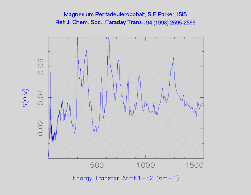 Inelastic Neutron Scattering spectrum of Magnesium pentadeuterocobalt, Mg₂CoD₅, measured on the TFXA instrument. Bands at 334, 439, 821 and 938 CM-1 are due to Mg2CoD4H(ax and eq isotopomers).