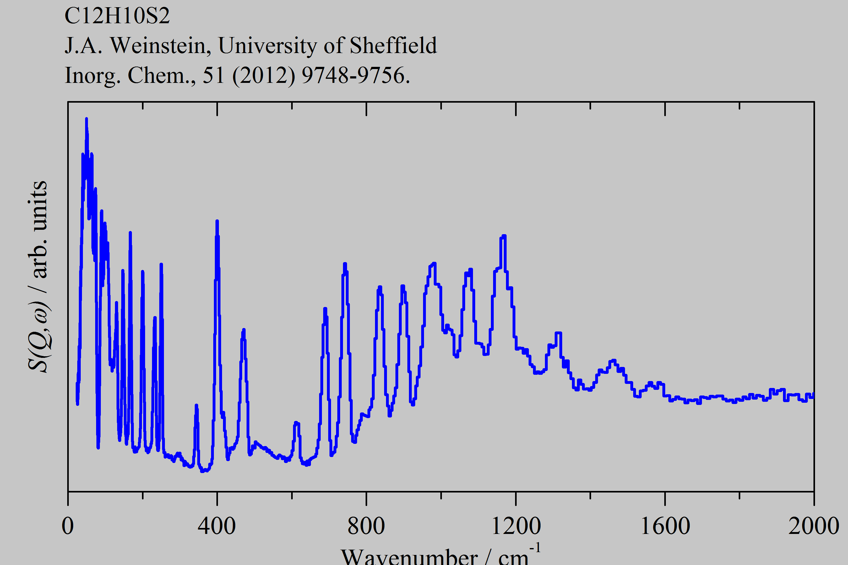 Inelastic Neutron Scattering spectrum of Diphenyl disulfide, C₁₂H₁₀S₂, measured on the TOSCA instrument. Ph-S-S-Ph.