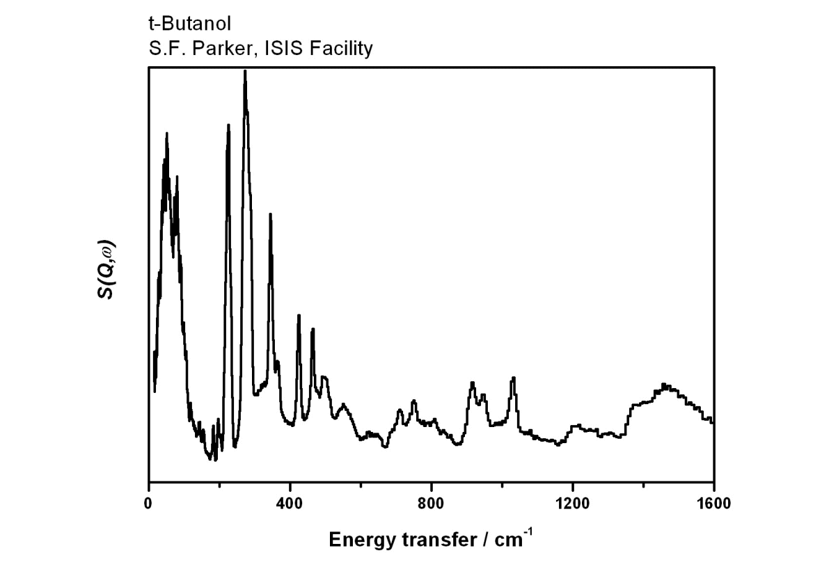 Inelastic Neutron Scattering spectrum of t-Butanol, (CH₃)₃CHOH, measured on the TOSCA instrument. 2-Methylpropan-2-ol.