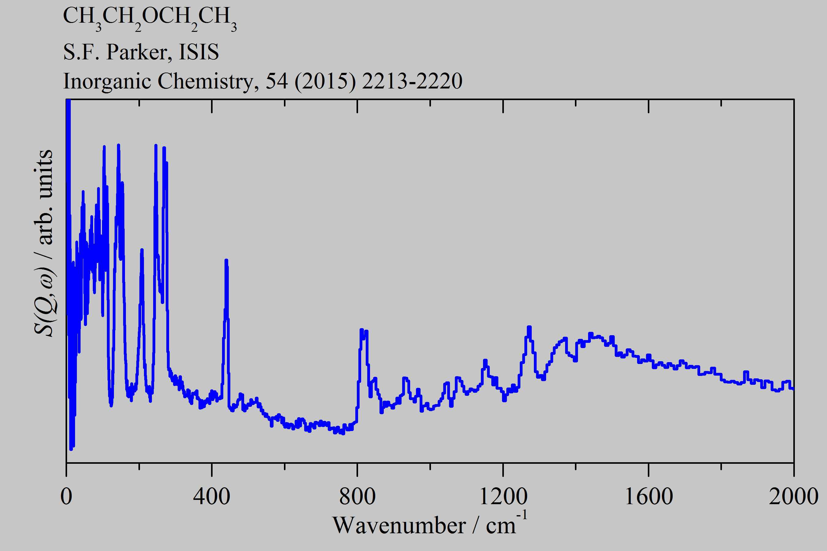 Inelastic Neutron Scattering spectrum of Diethylether, CH₃CH₂OCH₂CH₃, measured on the TOSCA instrument.