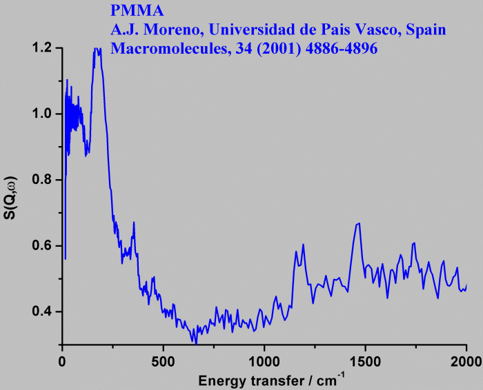 Inelastic Neutron Scattering spectrum of Polymethylmethacrylate, CH₂C(CH₃)(CO₂CH₃), measured on the TOSCA instrument.