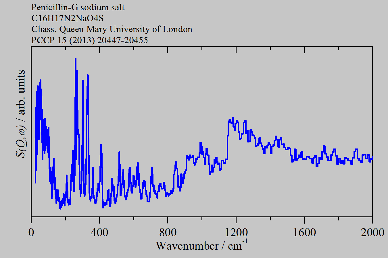 Inelastic Neutron Scattering spectrum of Penicillin-G sodium salt, C₁₆H₁₇N₂NaO₄S, measured on the TOSCA instrument. Benzylpenicillin sodium salt.