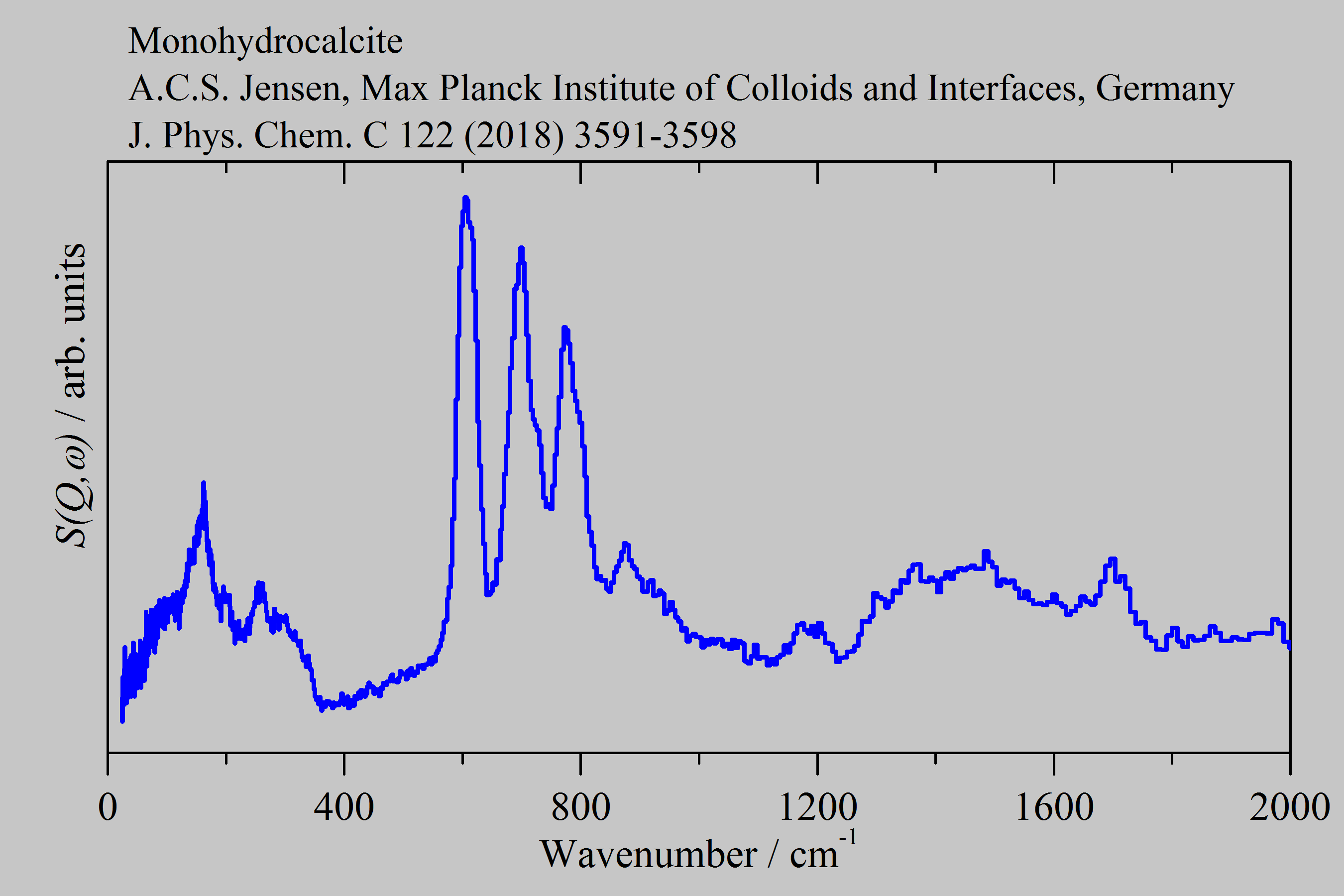 Inelastic Neutron Scattering spectrum of Monohydrocalcite, CaCO3.H2O, measured on the TOSCA instrument.