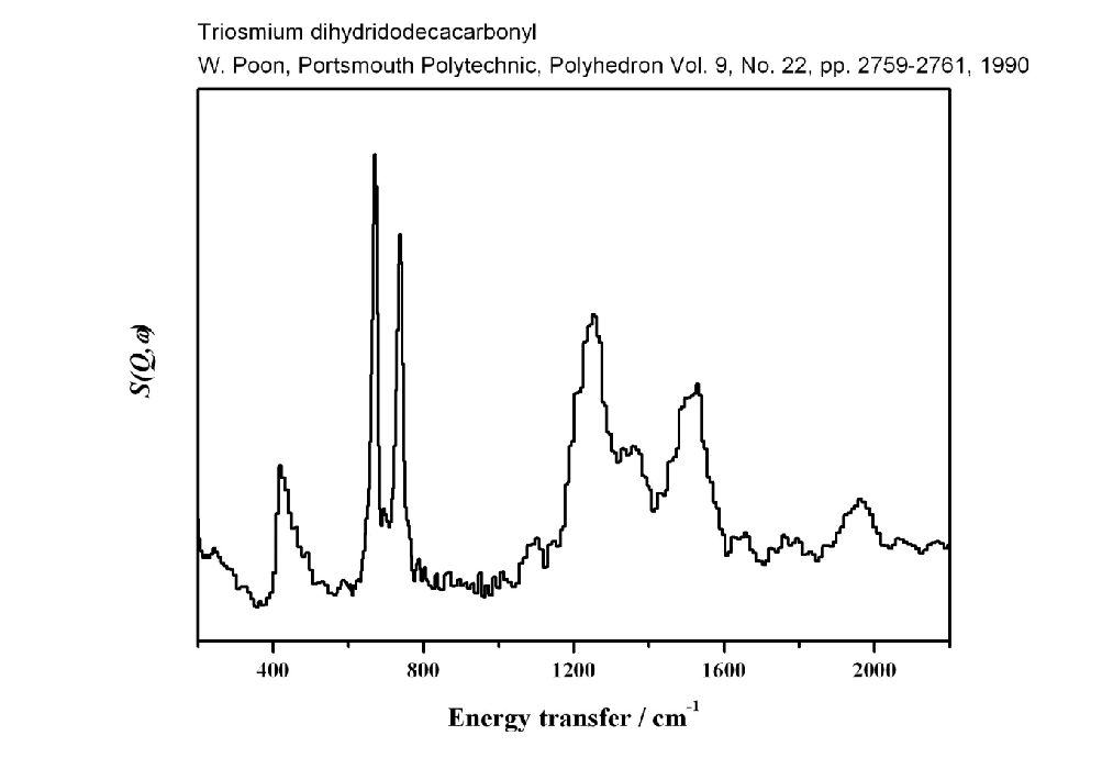 Inelastic Neutron Scattering spectrum of Triosmium dihydridodecacarbonyl, H₂Os₃(CO)₁₀, measured on the TFXA instrument.
