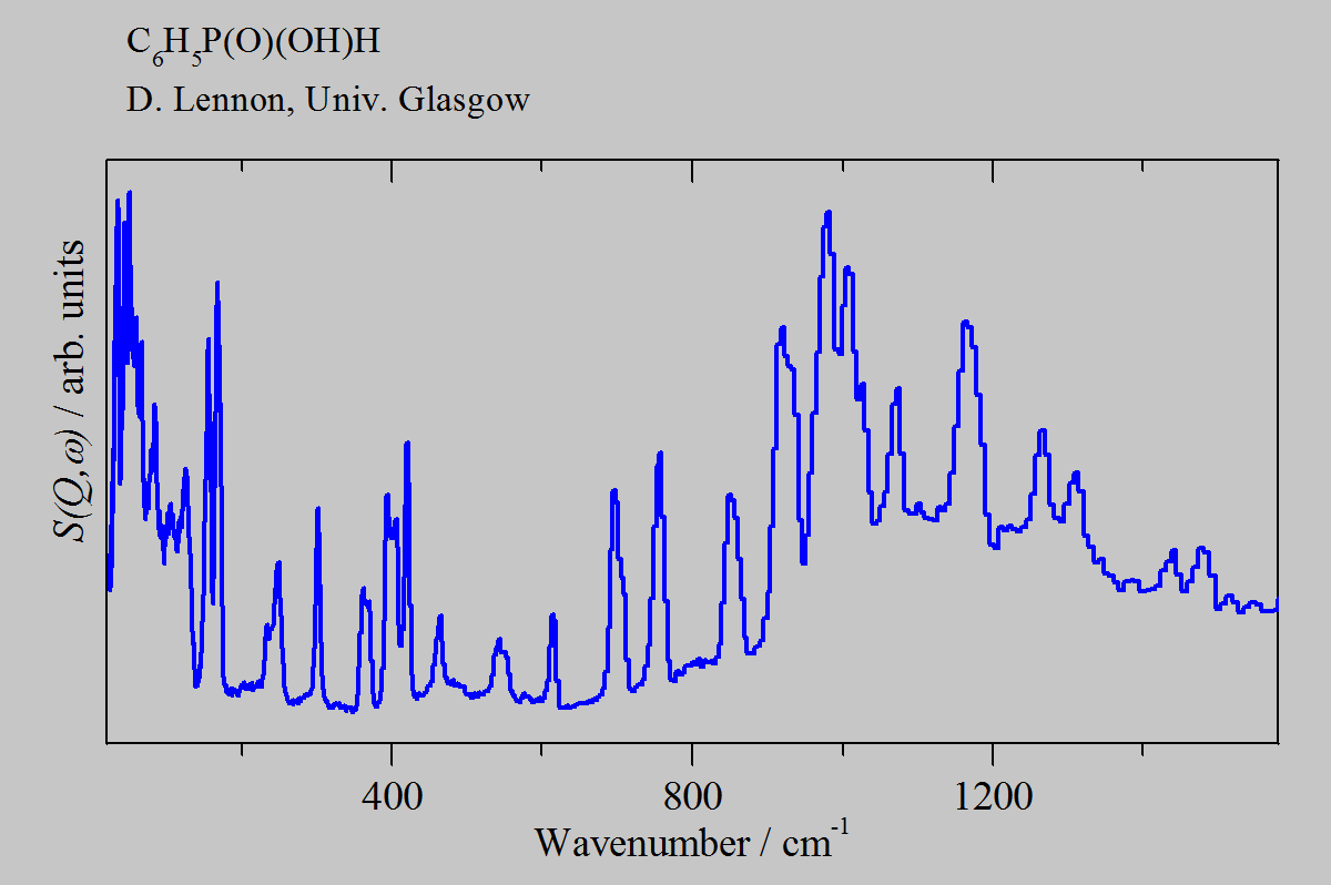 Inelastic Neutron Scattering spectrum of Phenylphosphinic acid, C6H5P(O)(OH)H, measured on the TOSCA instrument.