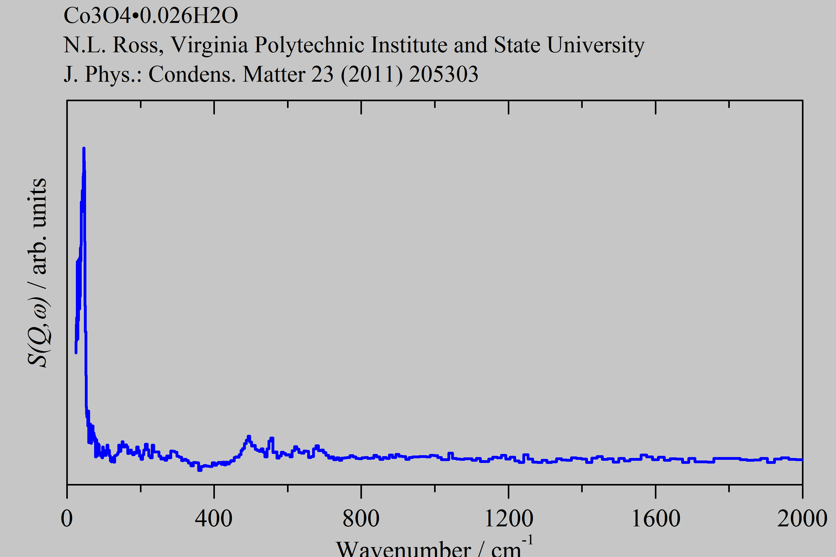 Inelastic Neutron Scattering spectrum of Hydrous cobalt (II) cobalt (III) oxide 40nm, Co3O4•0.026H2O, measured on the TOSCA instrument. Core (40 nm Co3O4) shell (H2O) structure.