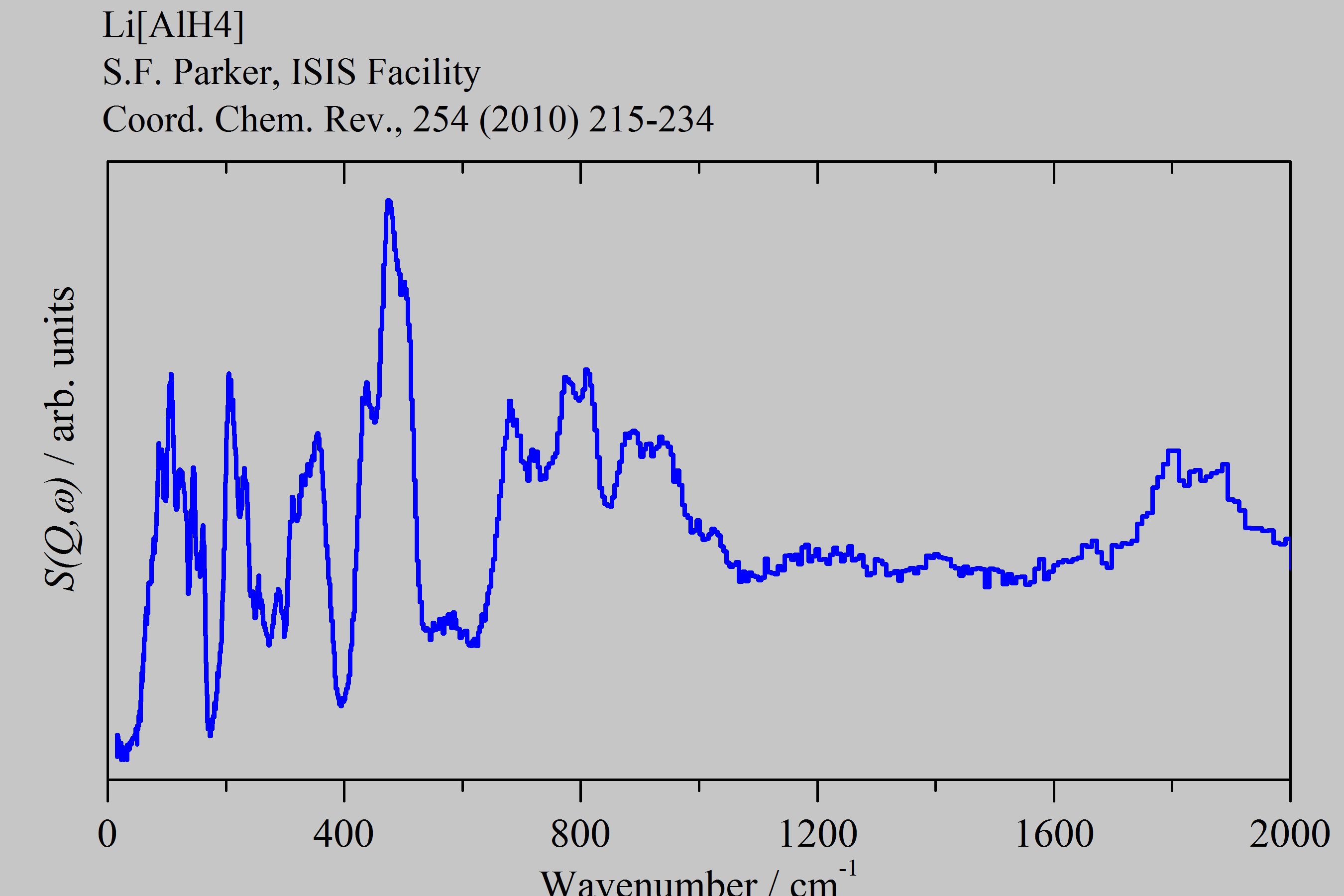 Inelastic Neutron Scattering spectrum of Lithium aluminium tetrahydride, Li[AlH₄], measured on the TOSCA-1 instrument.