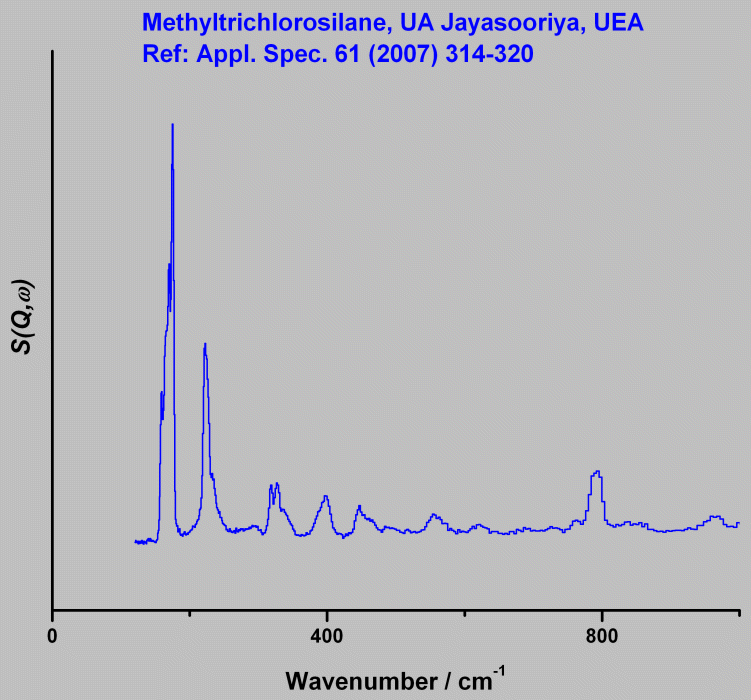 Inelastic Neutron Scattering spectrum of Methyltrichlorosilane, (CH₃)SiCl₃, measured on the TOSCA instrument.