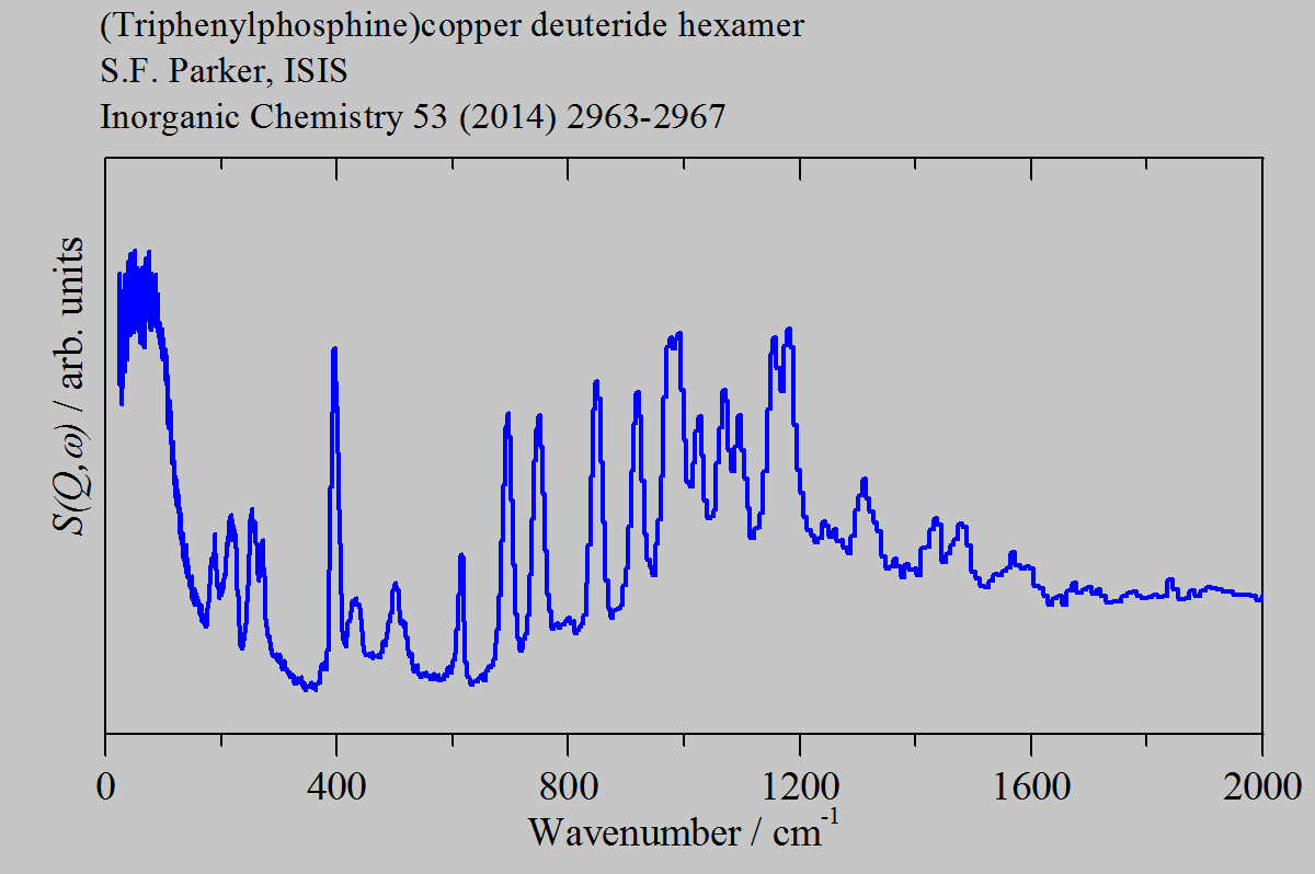 Inelastic Neutron Scattering spectrum of (Triphenylphosphine)copper deuteride hexamer, [(C₆H₅)₃PCuD]₆, measured on the TOSCA instrument. Stryker’s reagent.