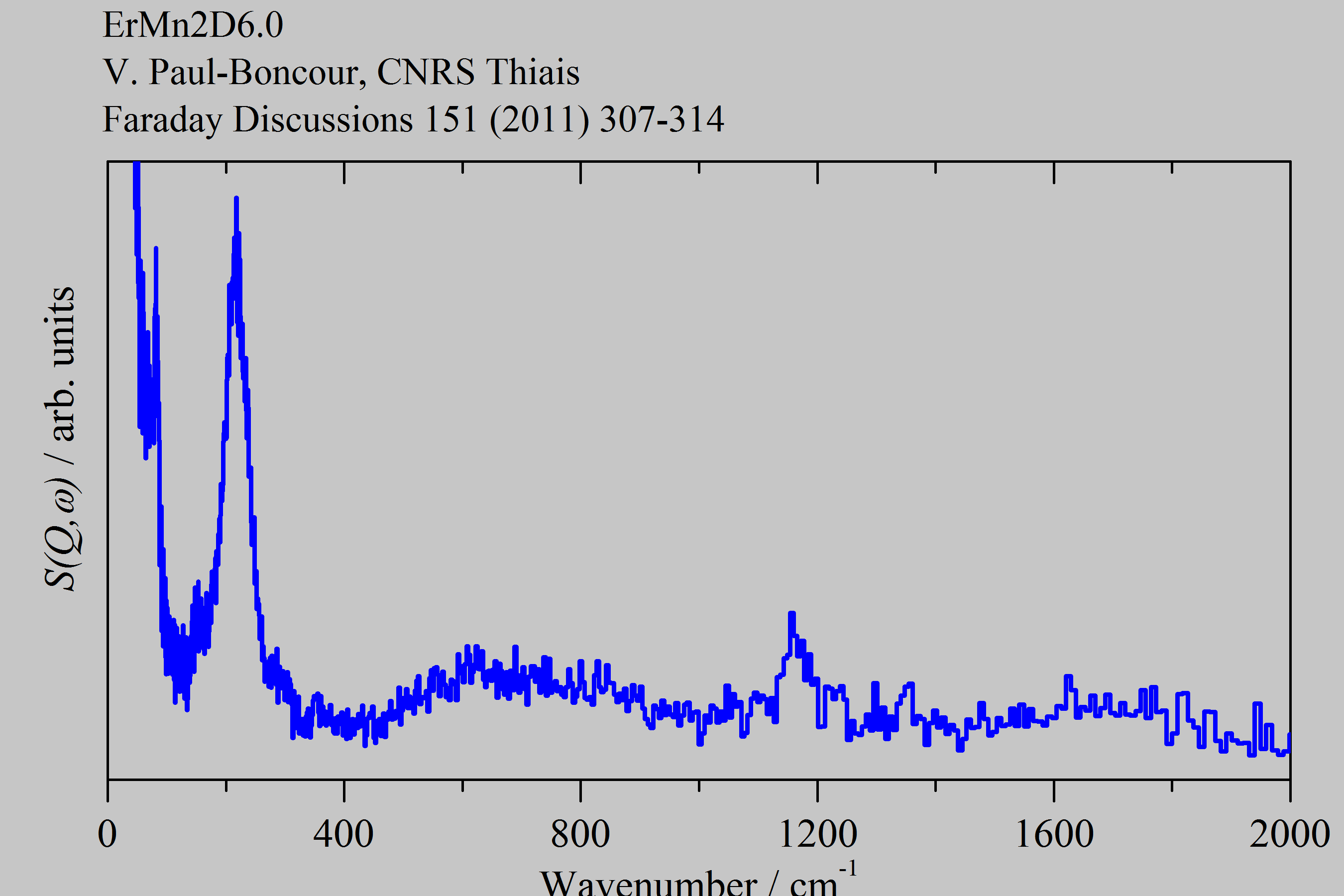 Inelastic Neutron Scattering spectrum of Erbium manganese deuteride x=6.0, ErMn2D6.0, measured on the TOSCA instrument. Ionic material Fm-3m space group: (Er,Mn)[MnD6], Er2+ and Mn2+ are disordered on the tetrahedral sites and [MnD6]2- ions occupy the octahedral sites. The peak at ~200 cm-1 is a crystal field excitation, not a phonon..