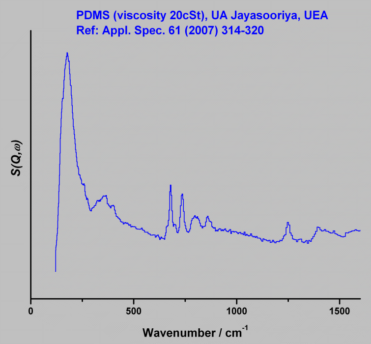 Inelastic Neutron Scattering spectrum of PDMS (PolyDiMethylSiloxane, viscosity 20 cSt), [Si(CH₃)₂O]n, measured on the TOSCA instrument.