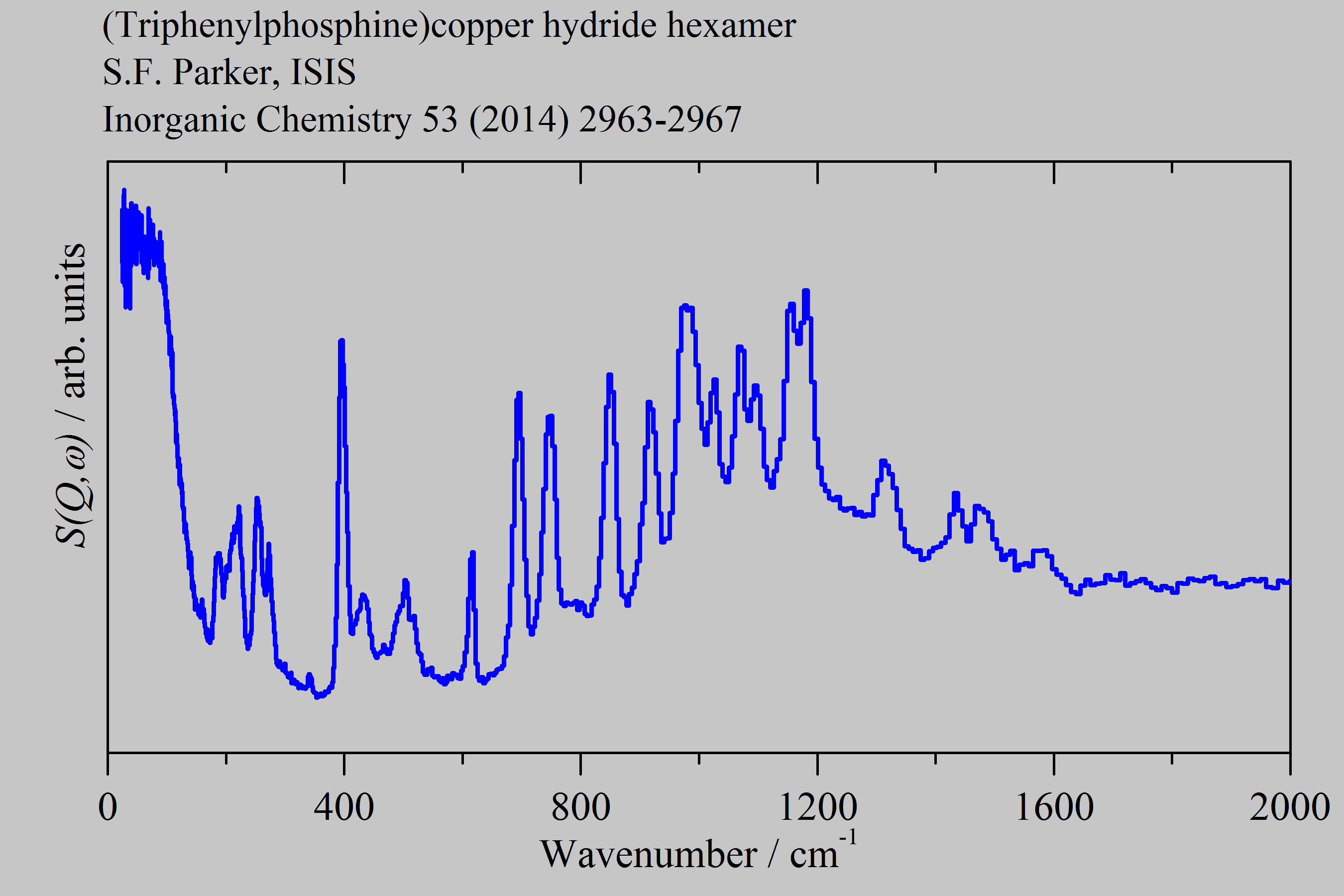 Inelastic Neutron Scattering spectrum of (Triphenylphosphine)copper hydride hexamer, [(C₆H₅)₃PCuH]₆, measured on the TOSCA instrument. Stryker’s reagent.