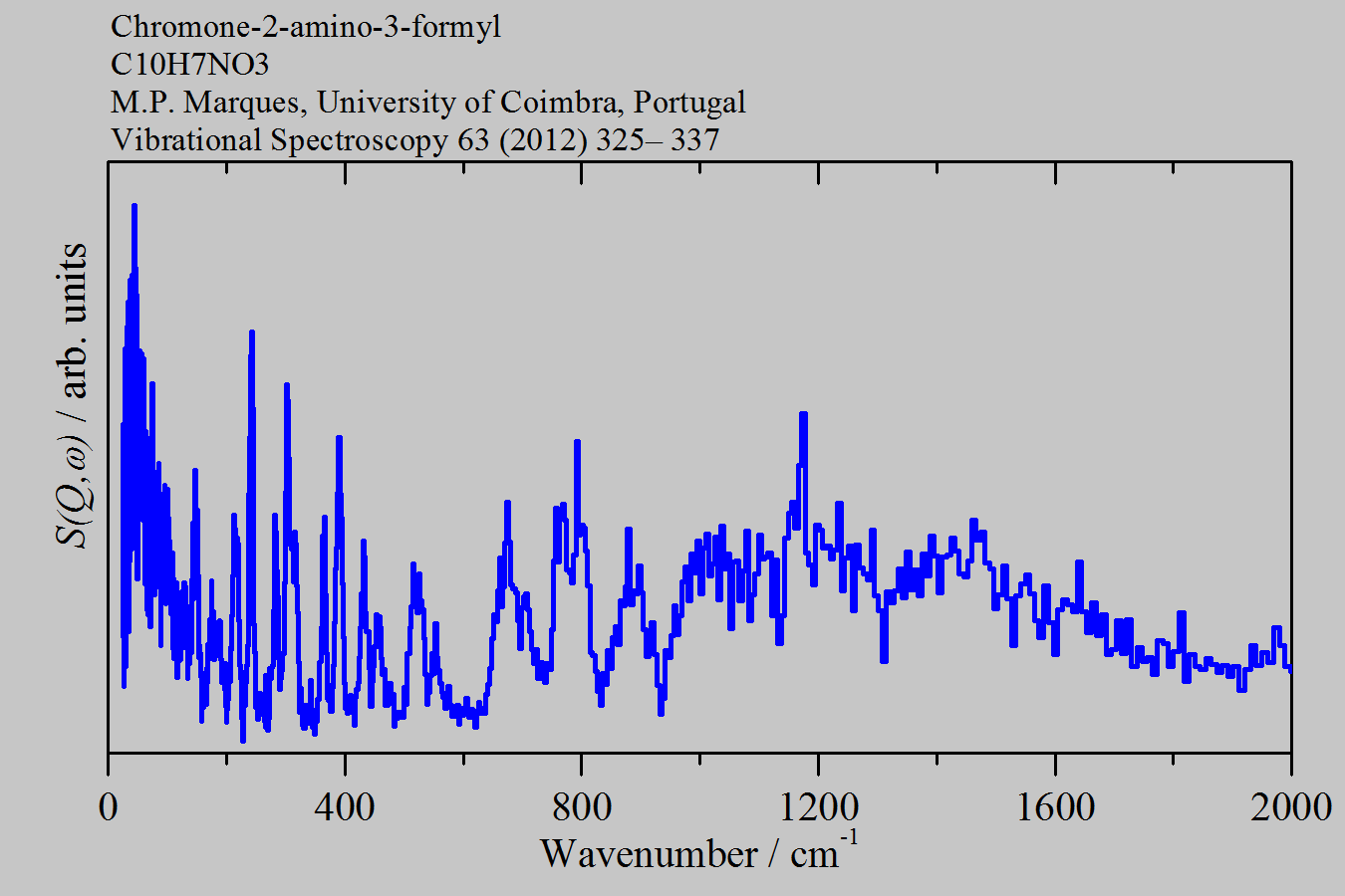 Inelastic Neutron Scattering spectrum of Chromone-2-amino-3-formyl, C₁₀H₇NO₃, measured on the TOSCA instrument.