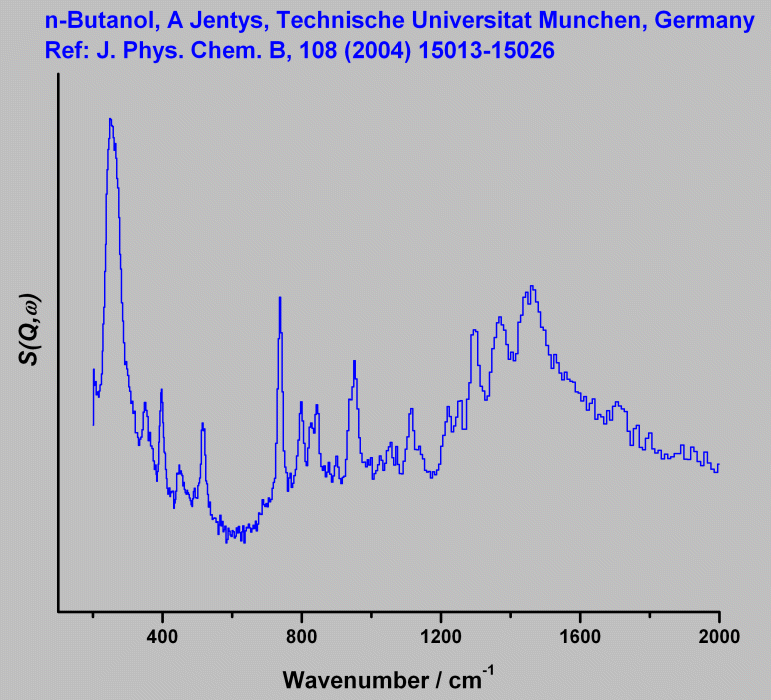 This spectrum has been superseded by better quality data of well-characterised phases. See: 1-Butanol amorphous (http://dx.doi.org/10.5286/edata/871) and 1-Butanol crystalline (http://dx.doi.org/10.5286/edata/872).