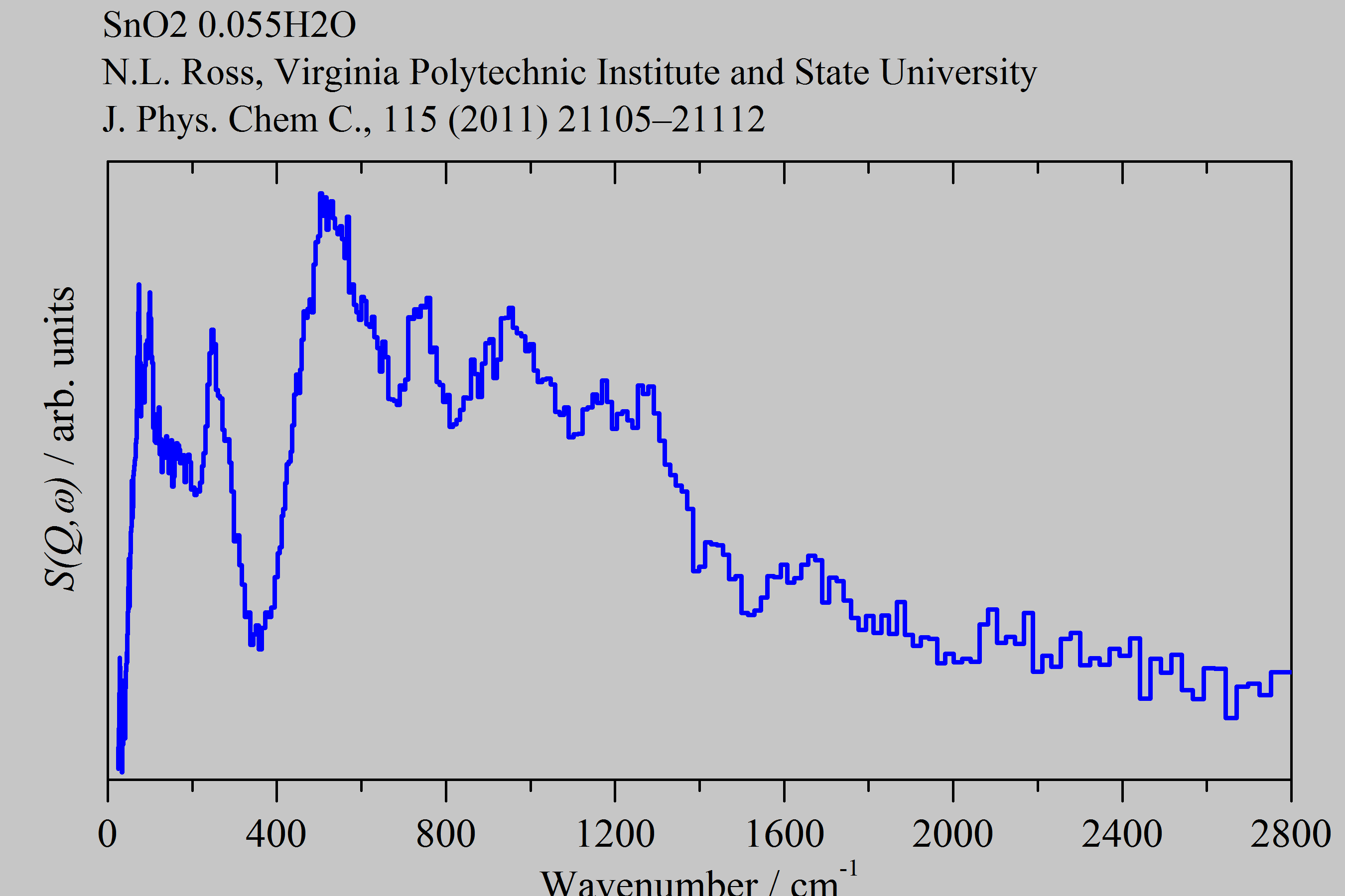 Inelastic Neutron Scattering spectrum of Hydrous cassiterite 6nm low water, SnO2 0.055H2O, measured on the TOSCA instrument. Core (6 nm SnO2) shell (H2O) structure.