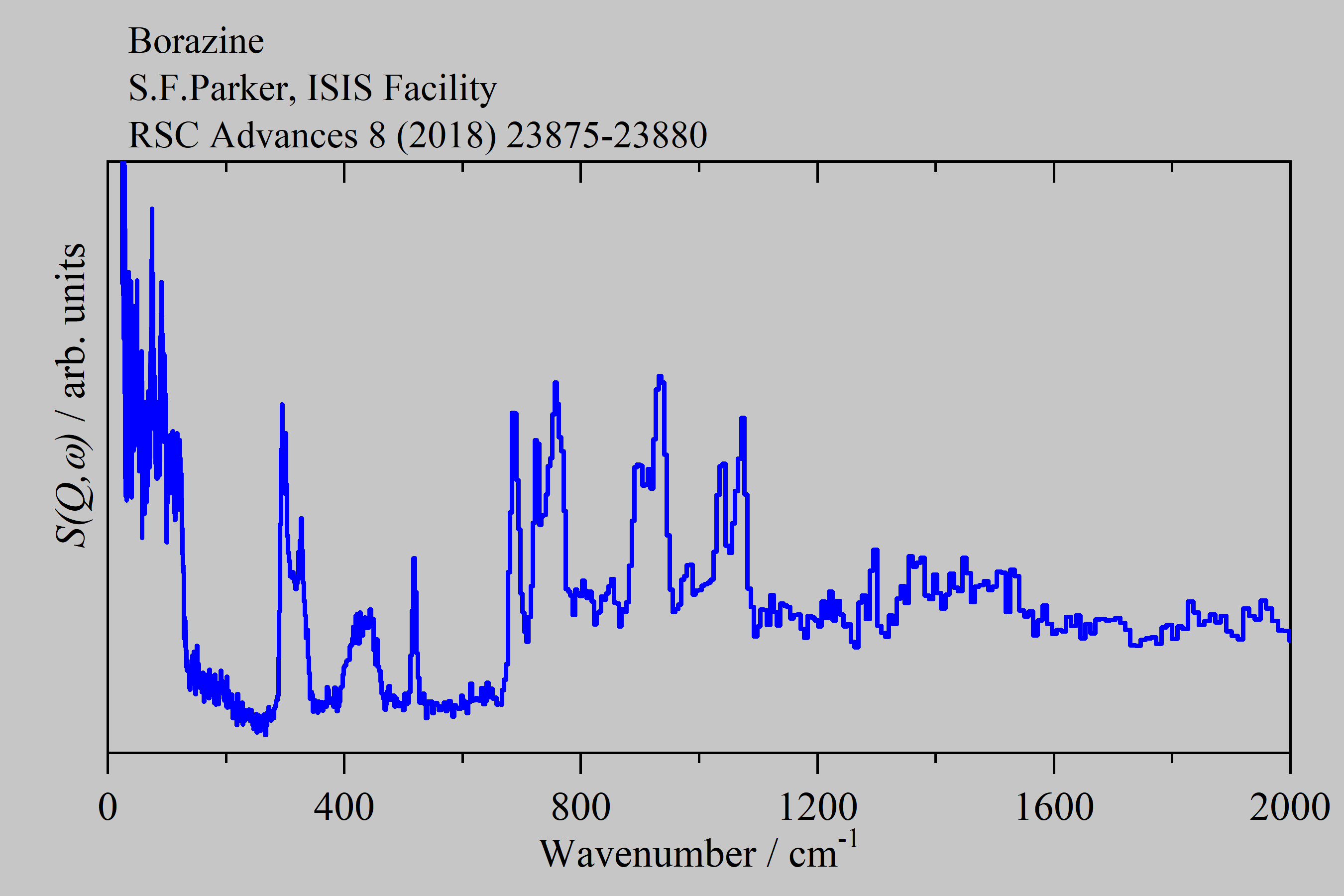 Inelastic Neutron Scattering spectrum of Borazine, B3N3H6, measured on the TOSCA instrument.