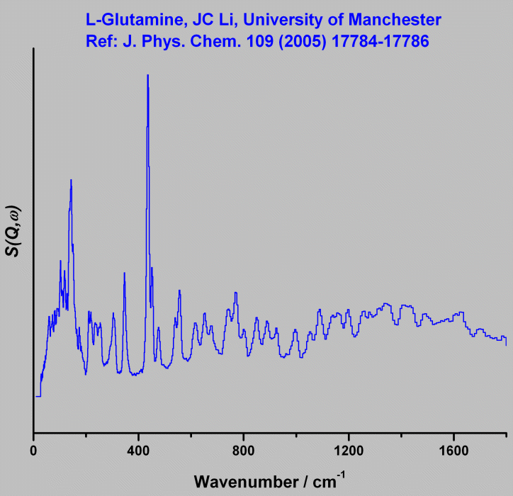 Inelastic Neutron Scattering spectrum of L-Glutamine, C₅H₁₀N₂O₃, measured on the TOSCA instrument.